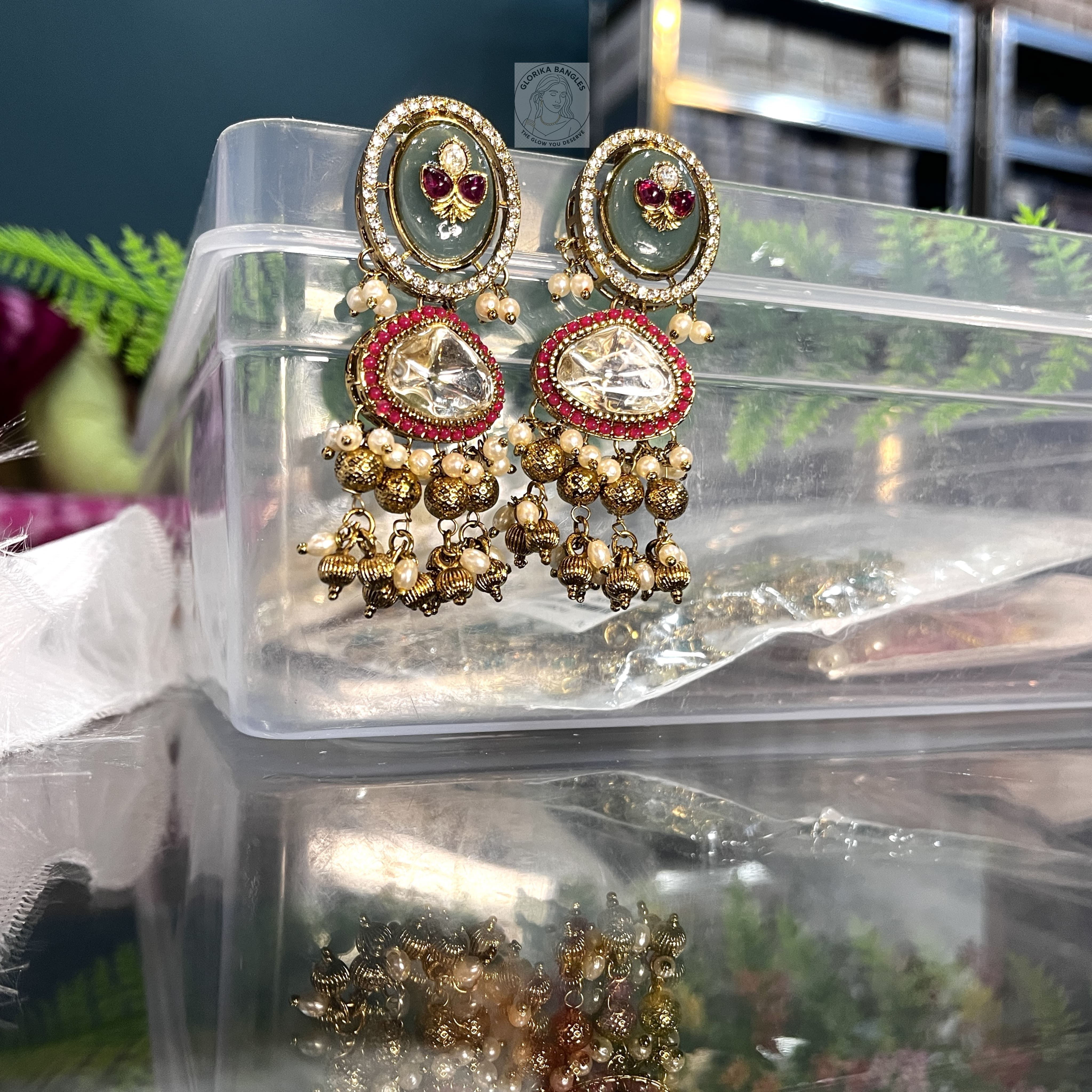 • The Earrings: The set includes a pair of matching drop earrings that mirror the choker’s design, featuring the same green enamel work and pearl-bead clusters for a cohesive look.