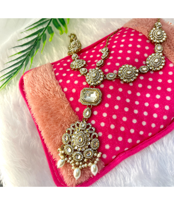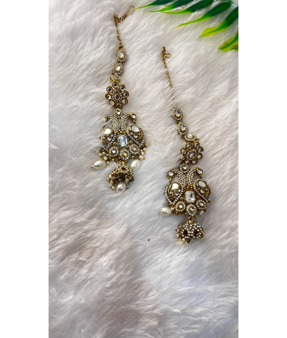 The Mathapatti is specifically engineered to be lightweight yet visually heavy, featuring high-quality pearls that rest gently against the forehead. What sets this collection apart is the Sahara Earrings; the supporting chains are not just functional but are embellished with micro-pearls to blend seamlessly into bridal braids or buns.