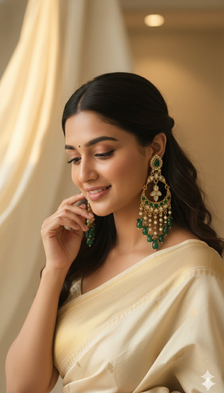 Elevate your jewelry collection with our Emerald Empress Chandbalis, a masterpiece of traditional craftsmanship. These earrings feature a classic crescent (Chand) silhouette crafted in a rich matte gold finish.