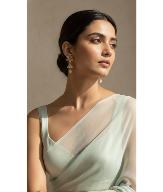 Suspended from the floral centerpiece is a dainty, shimmering Jhumka bell, meticulously pavé-set with brilliant-cut cubic zirconia. The rose gold finish adds a romantic touch, making these the perfect accessory for both festive celebrations and sophisticated evening events. Whether paired with a silk saree or a modern fusion outfit, these earrings offer a subtle yet sparkling statement.