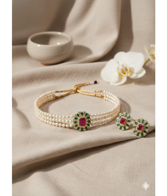 Elevate your ethnic ensemble with our Royal Mayura Pearl Choker Set, a tribute to traditional Indian jewelry artistry. The necklace features three perfectly aligned rows of premium white pearls, known for their lustrous finish and smooth texture. At the heart of the piece lies a breathtaking floral medallion, housing a deep-set ruby red stone encircled by vibrant emerald green drops and a halo of brilliant-cut white stones.