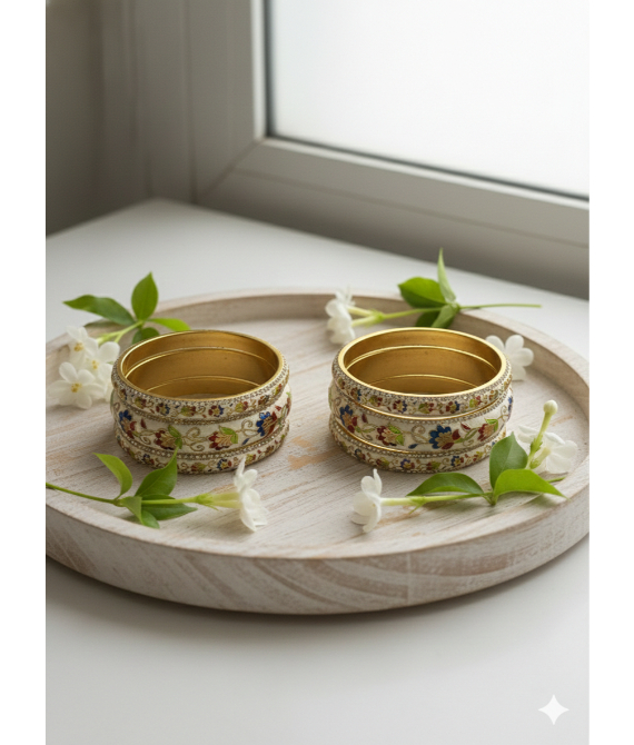 Materials: Built on a durable high-quality alloy base with a smooth ivory enamel finish. The intricate floral patterns are etched and filled using classic Meenakari techniques, complemented by fine-cut faux diamonds (Zirconia) along the rims.