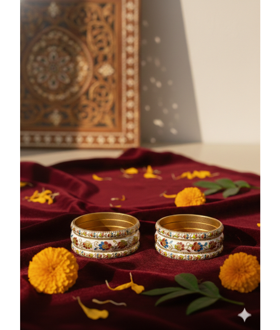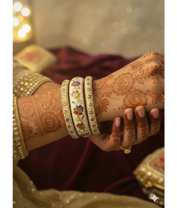 Design & Artistry: Each bangle features a hand-painted floral vine pattern, inspired by Mughal gardens. The central thick kada is flanked by two slender matching bangles, creating a balanced and sophisticated "stack" look.