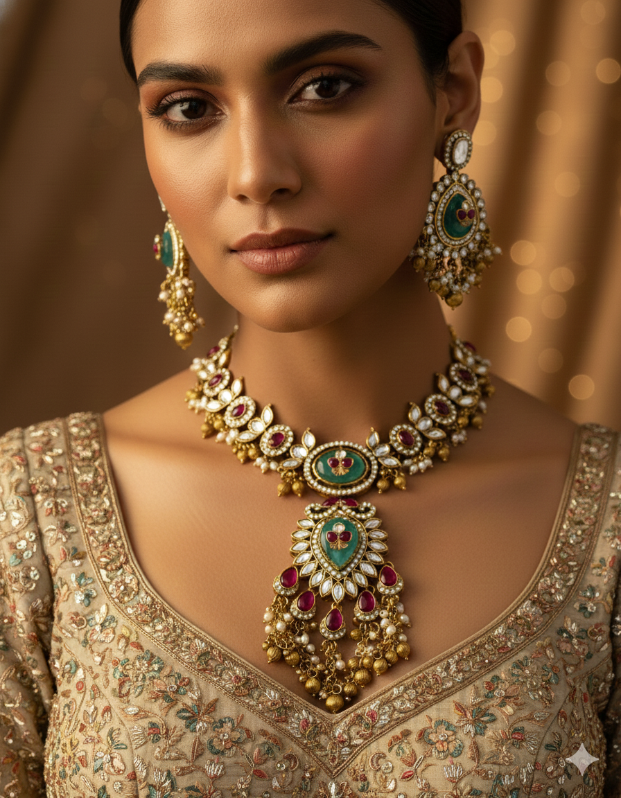 This handcrafted jewelry set captures the timeless essence of traditional Indian artistry, making it an ideal choice for weddings, festivals, and grand celebrations.