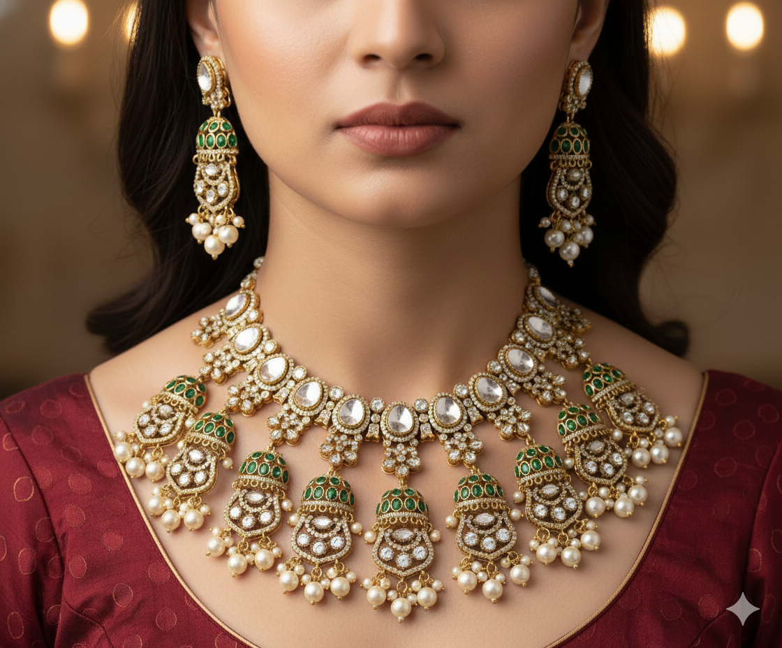 • Style Tip: This set pairs beautifully with a deep-toned Saree or a heavily embroidered Lehenga, where the emerald green and pearl accents can truly pop.