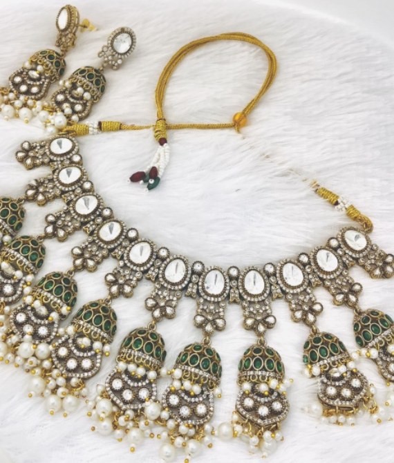 • The Necklace: A wide, collar-style choker crafted with an antique gold-toned finish. It features a row of large, shimmering white Kundan stones at the center. Hanging from the main band are eight elaborate Jhumka drops intricately detailed with green enamel work and small white crystal embellishments.
