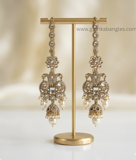 The Mathapatti is specifically engineered to be lightweight yet visually heavy, featuring high-quality pearls that rest gently against the forehead. What sets this collection apart is the Sahara Earrings; the supporting chains are not just functional but are embellished with micro-pearls to blend seamlessly into bridal braids or buns.