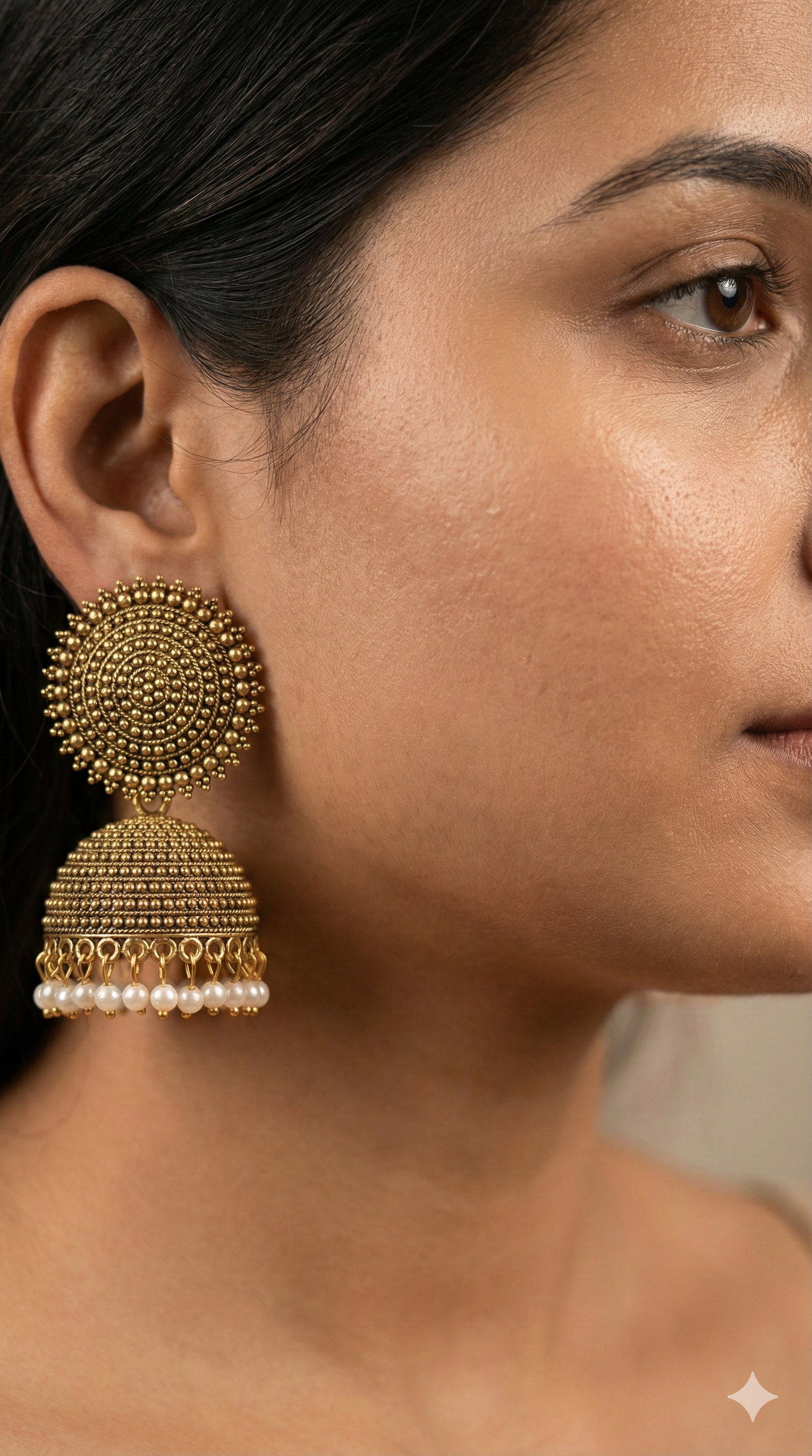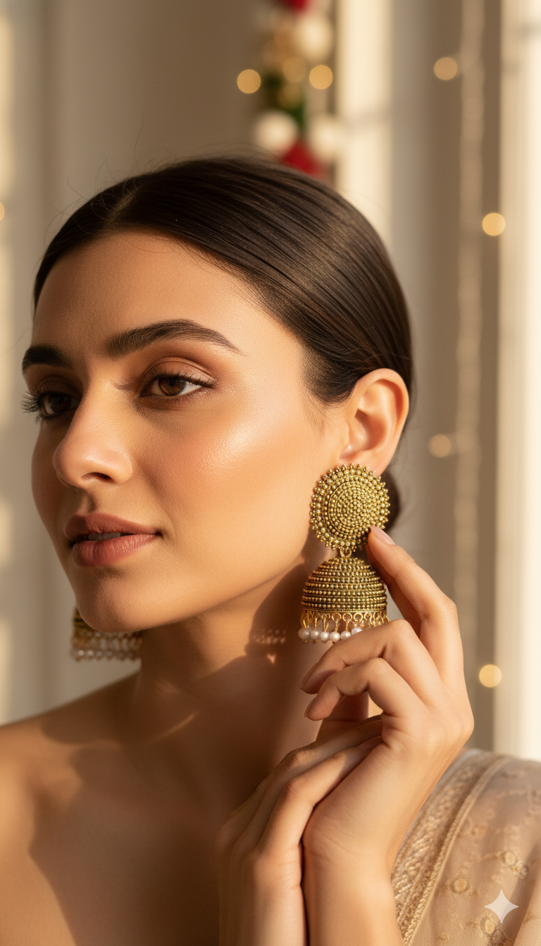 Elevate your jewelry collection with these exquisite Gold-Plated Jhumka Earrings. Drawing inspiration from vintage temple jewelry, these earrings feature a dual-layered design: a bold, mandala-style circular stud and a classic bell-shaped (Jhumka) drop.