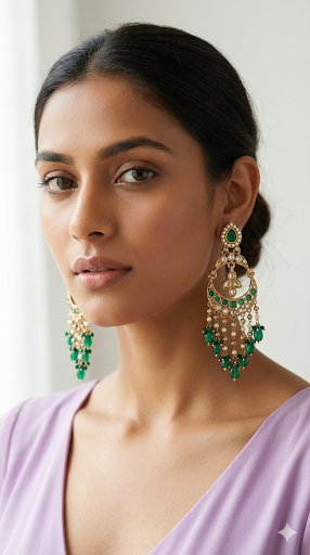 The design is intricately detailed with shimmering white stones and vibrant green accents that frame a central floral motif. To add movement and grace, the base is finished with multiple layers of delicate pearl drops and faceted green beads that sway with every step. Perfect for weddings, festive celebrations, or pairing with your favorite lehenga or saree, these earrings are designed to make a statement of regal elegance.