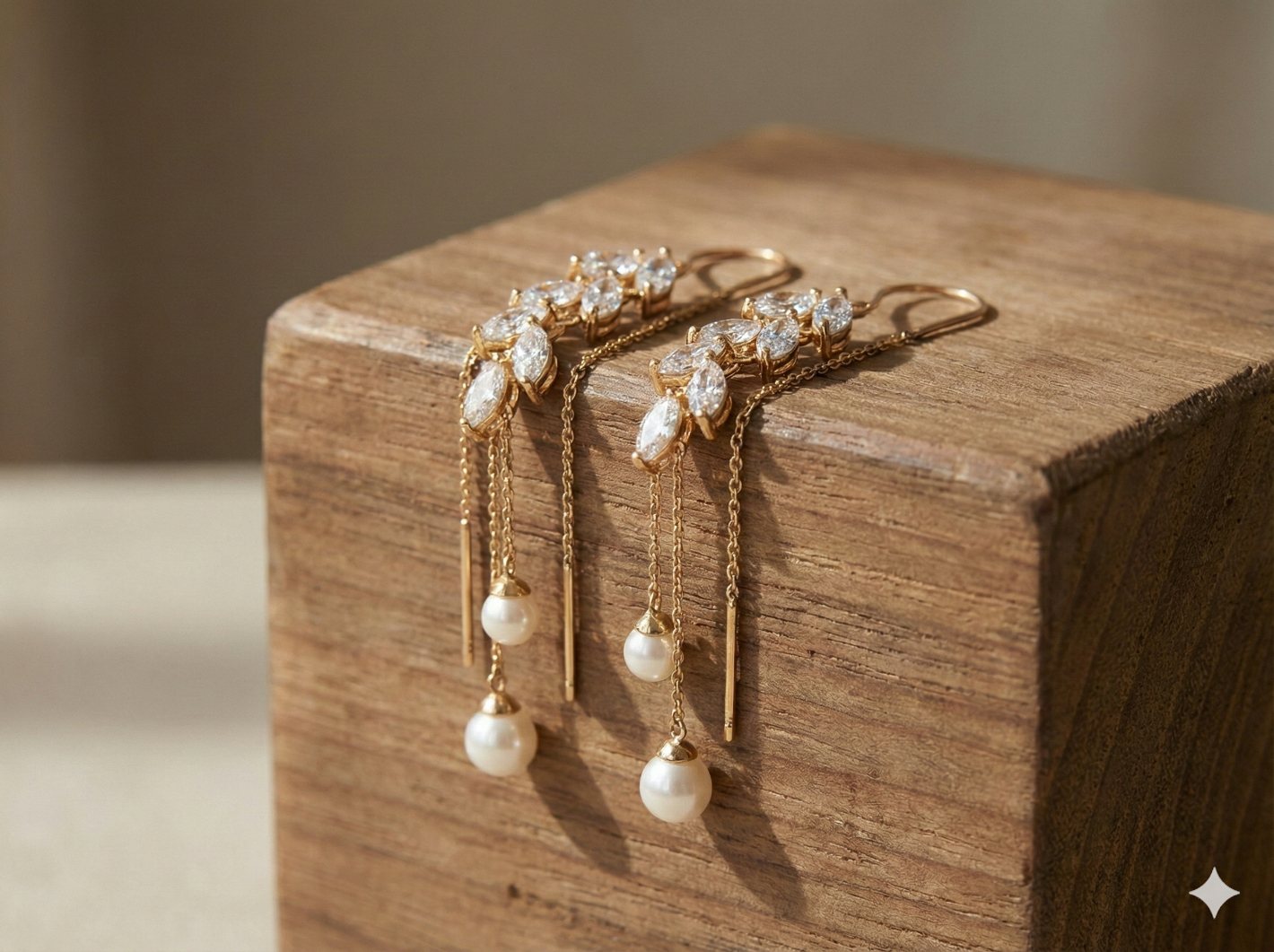 Timeless Elegance in Every Sway Our Aranya Leaf Sui Dhaga earrings are a masterpiece of imitation jewelry, designed for the woman who loves understated luxury. The design features a stunning sequence of marquise-cut cubic zirconia stones arranged in a delicate leaf motif that sits gracefully against the earlobe.