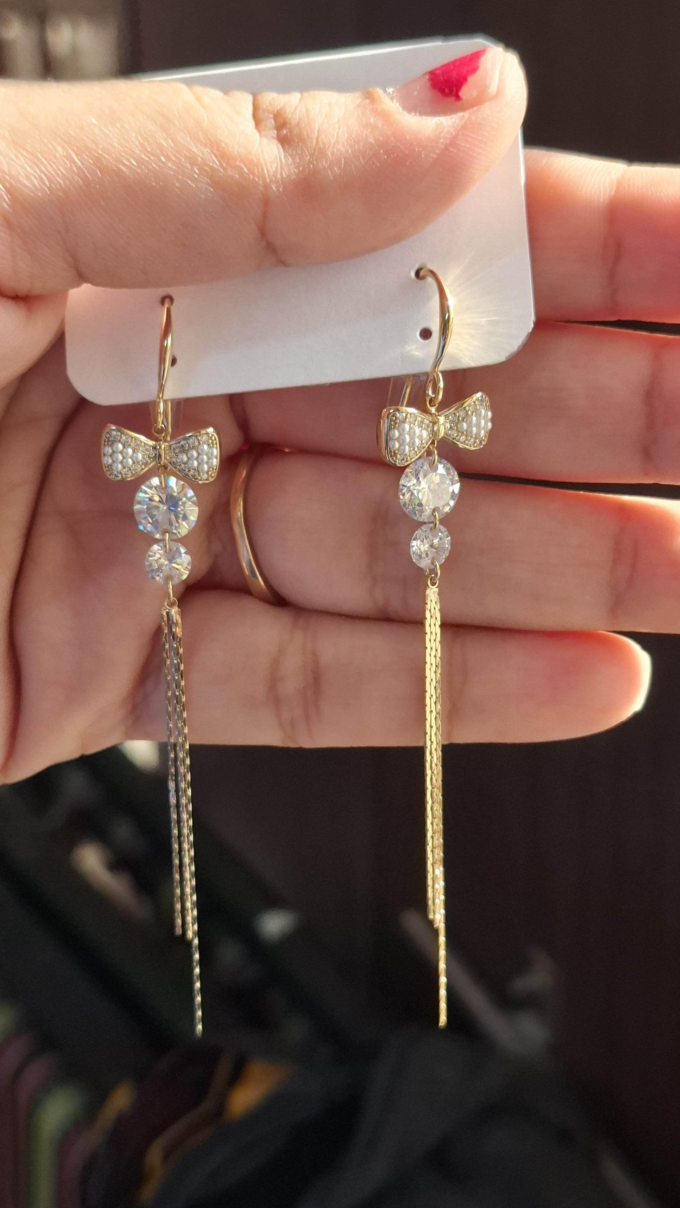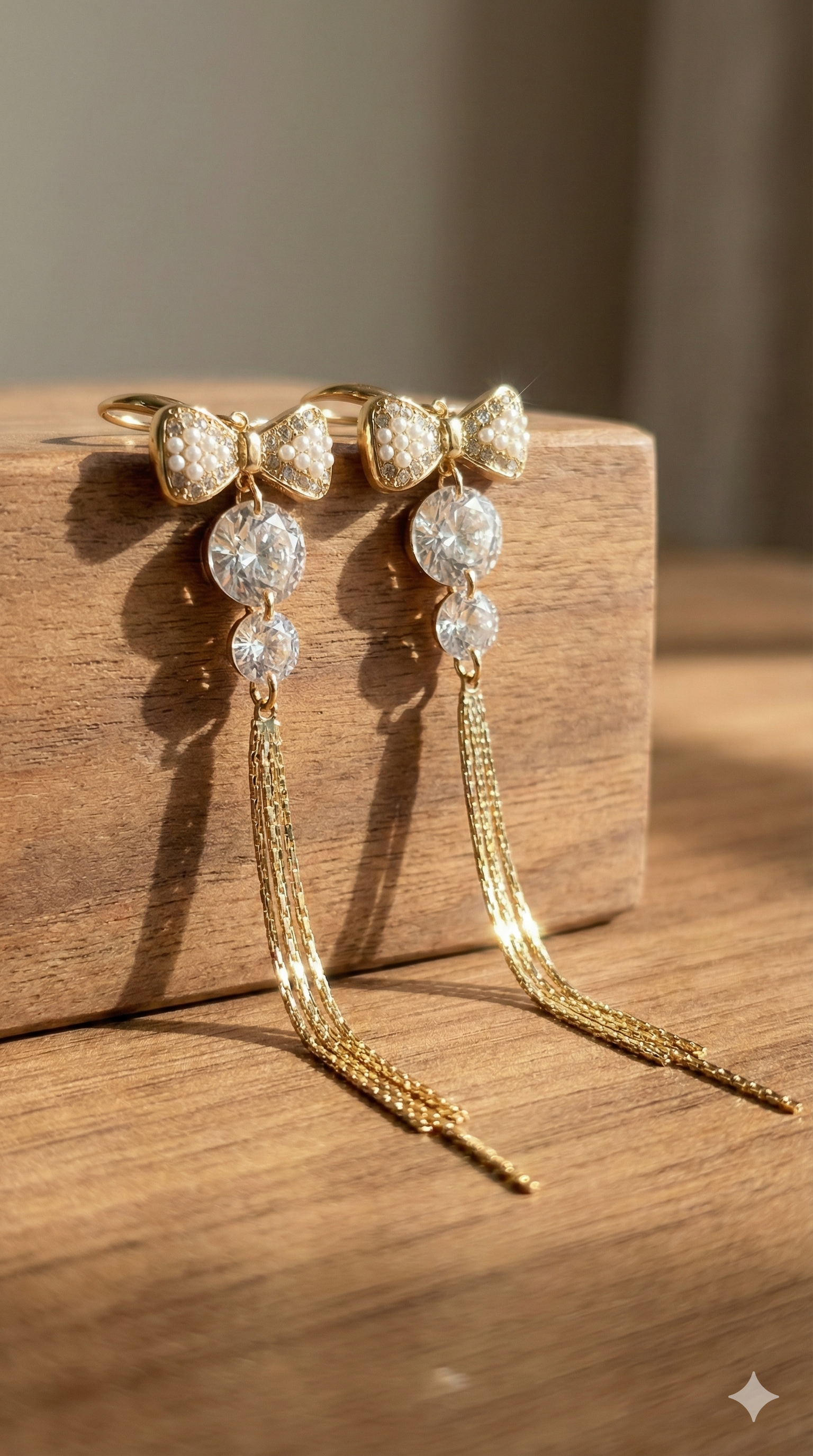 At the top, a dainty micro-pearl bow sits comfortably against the ear, symbolizing grace and playfulness. Suspended from the bow are two brilliant-cut round stones (simulated diamonds or cubic zirconia) in a tiered setting, designed to catch and refract light with every movement. The piece is finished with a trio of ultra-fine gold-plated chains that create a dramatic yet weightless tassel effect, elongating the neck and adding a sophisticated movement to your look. Perfect for weddings, black-tie galas, or as a high-fashion statement accessory.