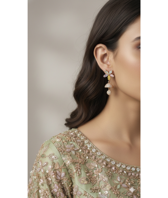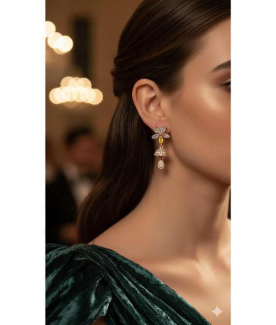 Suspended from the floral centerpiece is a dainty, shimmering Jhumka bell, meticulously pavé-set with brilliant-cut cubic zirconia. The rose gold finish adds a romantic touch, making these the perfect accessory for both festive celebrations and sophisticated evening events. Whether paired with a silk saree or a modern fusion outfit, these earrings offer a subtle yet sparkling statement.
