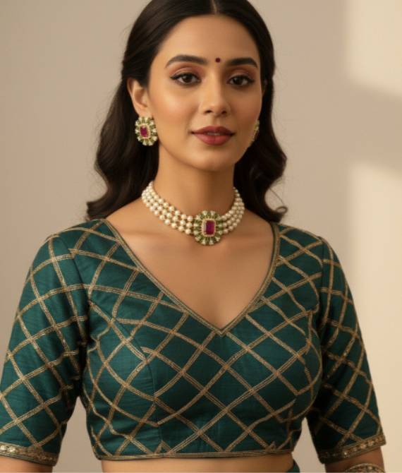 This choker is designed to sit gracefully on the collarbone, making it an ideal pairing for high-neck blouses, Kanjeevaram sarees, or deep-neck Anarkalis. The matching floral earrings reflect the central motif, providing a cohesive and sophisticated aesthetic without the need for additional accessories.