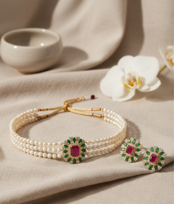 Elevate your ethnic ensemble with our Royal Mayura Pearl Choker Set, a tribute to traditional Indian jewelry artistry. The necklace features three perfectly aligned rows of premium white pearls, known for their lustrous finish and smooth texture. At the heart of the piece lies a breathtaking floral medallion, housing a deep-set ruby red stone encircled by vibrant emerald green drops and a halo of brilliant-cut white stones.