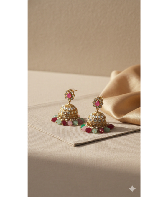 The design begins with a delicate floral stud centered by a pear-cut ruby pink stone. Below, the bell is fringed with a playful yet sophisticated array of pastel-toned smooth beads, including shades of mint, rose, and deep berry. Whether you are dressing for a wedding, a festive celebration, or a formal cultural event, these earrings offer a perfect balance of vintage grandeur and contemporary color palettes.