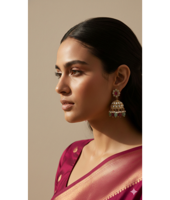 Embrace timeless heritage with these exquisite Traditional Bell-Shaped Jhumkas. Meticulously crafted with a rich gold-toned finish, the dome (jhumka) is encrusted with shimmering clear stones that catch the light from every angle.