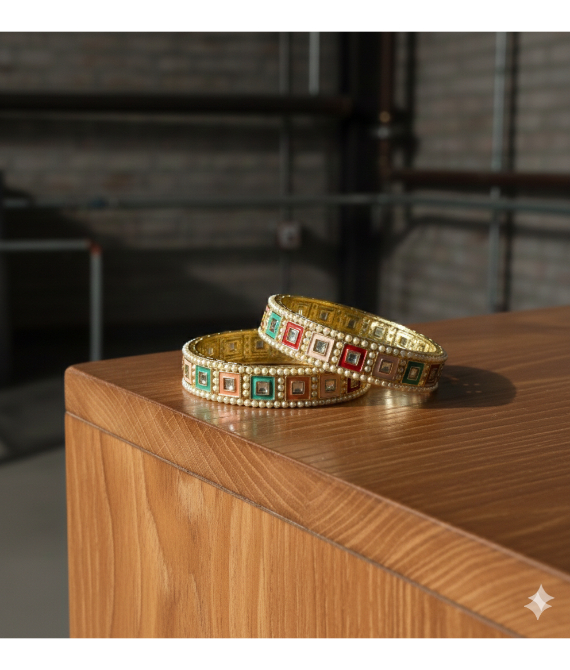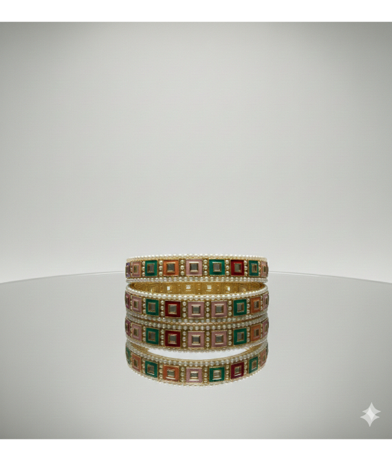 Our Vibrant Heritage Pearl-Bordered Bangles are a celebration of color and precision. Inspired by the ancient art of Meenakari, each bangle features a sequence of multi-colored enamel squares—ranging from deep emerald and ruby red to soft blush and ochre—creating a "mosaic" effect that catches the light from every angle.