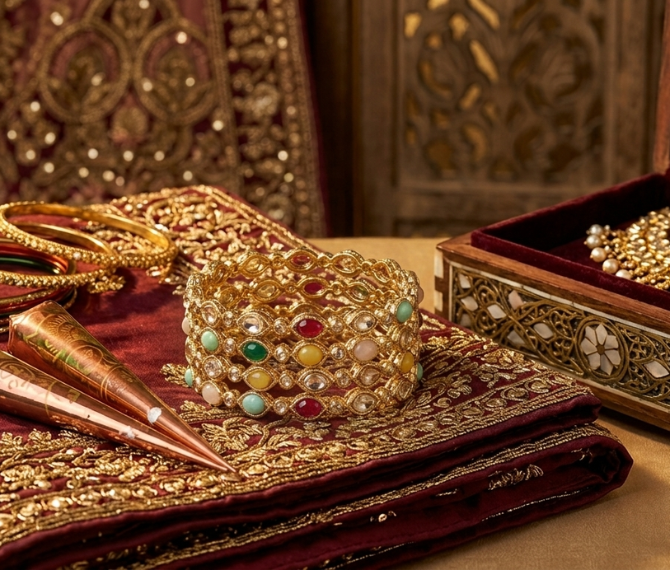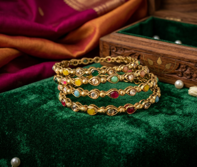Each bangle is meticulously set with a spectrum of colored stones—including ruby red, emerald green, and sapphire blue—representing the nine celestial bodies (Navagrahas) to bring balance and prosperity to the wearer. The lightweight yet sturdy design makes them comfortable for long wedding ceremonies, while the high-quality gold plating ensures a long-lasting luster. Pair them with a Kanjeevaram saree or a bridal lehenga to complete your regal look.