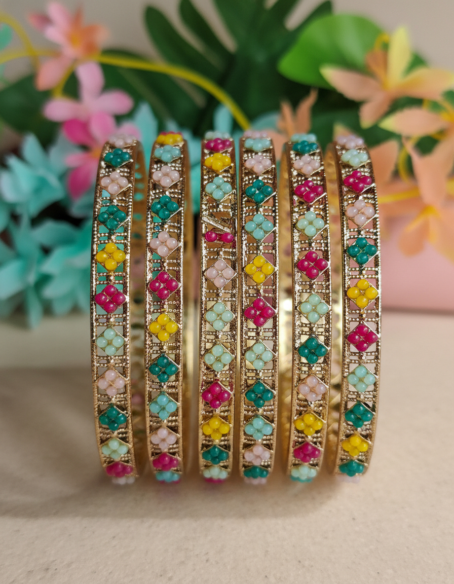The standout feature is the repetitive floral beadwork, showcasing a kaleidoscope of shades including ruby pink, sunny yellow, turquoise blue, and emerald green. Each "flower" is composed of four small, smooth-finished beads, meticulously set within a geometric open-work frame. The lightweight design ensures comfort for all-day wear, while the radiant gold plating provides a luxurious look that mimics real gold. Whether paired with a classic silk saree, a designer lehenga, or even a simple kurta, these bangles offer a versatile and joyful touch to any outfit.
