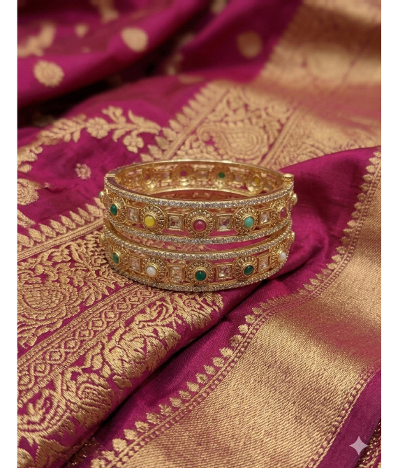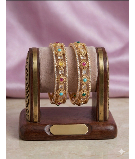 The centerpieces feature circular motifs embedded with multi-colored cabochon stones—reminiscent of the classic Navratna palette—interspersed with high-quality square kundan stones. The outer borders are lined with shimmering micro-stones to provide an extra layer of brilliance. Designed for comfort and durability, these bangles are the perfect statement piece for brides, bridesmaids, or anyone looking to shine at a traditional celebration.