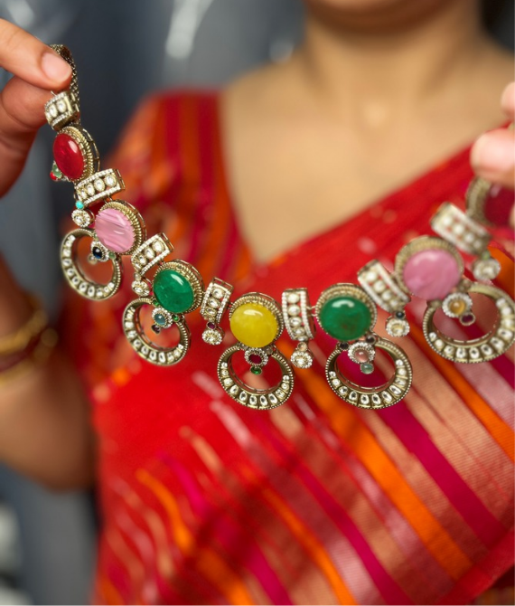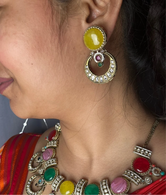 Adorned with bold cabochon stones in rich hues of emerald green, ruby red, sunshine yellow, and blush pink, each element is delicately set in antique gold polish. The crescent (chand) motifs embellished with kundan detailing and fine pearls add a Mughal-era charm, making it a perfect heirloom-style piece.
