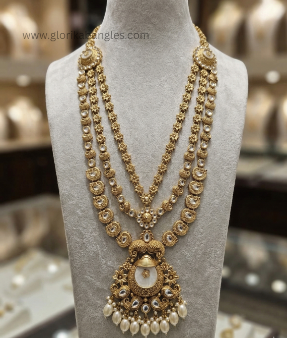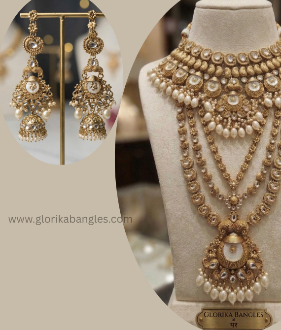 Intricate Artistry: Each piece boasts meticulous hand-crafted textures, an antique gold polish for a heritage look, and genuine Kundan-style white stones with elegant pearl hangings.