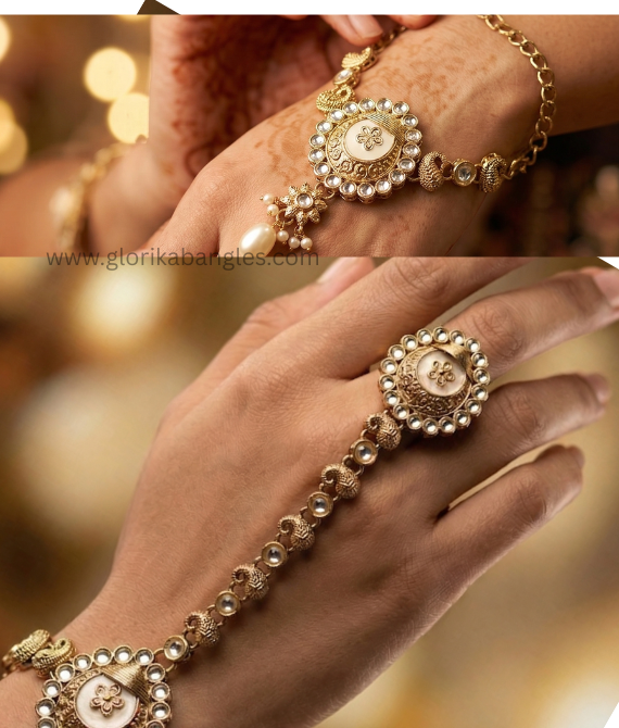 Elevate your bridal ensemble with this stunning Antique Gold Kundan Hathphool & Bracelet Set, a true testament to timeless craftsmanship. Specially curated for your most precious moments, this set is designed to make you feel like royalty.