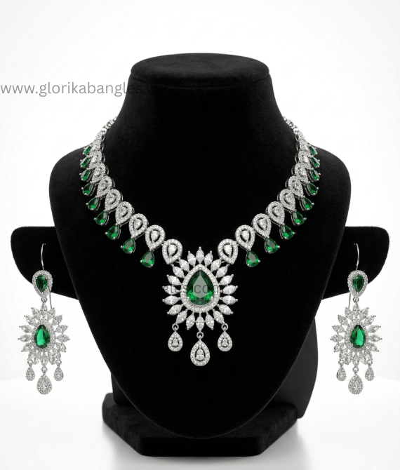 The Pinnacle of Craftsmanship The Emerald Radiance set is a masterpiece of precision. Each individual stone is hand-set to ensure a seamless flow of light, mimicking the refractive index of natural diamonds and fine emeralds. The choker features a stunning central teardrop centerpiece, surrounded by a halo of marquise and round-cut American Diamonds that create a "sunburst" effect.